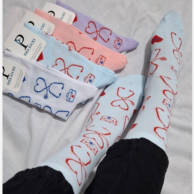 این جورابا با طرحهای مرتبط با شغل دوستداشتنی پرستاری مثل گوشی پزشکی، قلب مهربون و کیف امداد، یه جورایی نشون میده که چقدر کارتون با ارزشه. تازه ساقداره و پا رو کامل میپوشونه و خیلی هم راحته، مخصوصاً واسه شیفتهای طولانی بیمارستان.