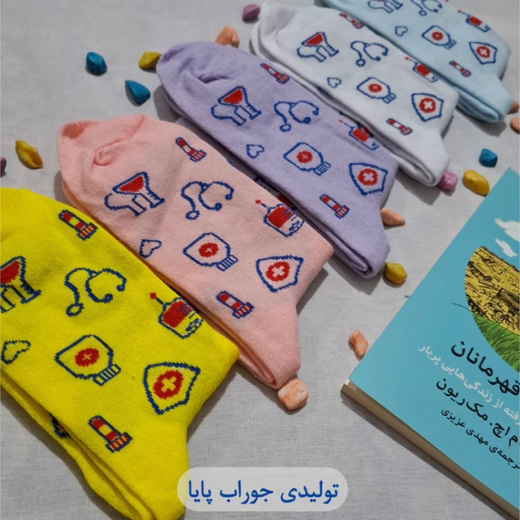 روی این جورابای باحال همه چی پیدا میشه! از گوشی پزشکی و سرنگ گرفته تا میکروسکوپ و نماد سلامتی . انگار یه آزمایشگاه کامل و رنگیرنگی رو توی جورابت جا دادی! طرحش خیلی فانتزی و خاصه و توی 5 تا رنگ شاد و پاستلی (زرد، صورتی، یاسی، سفید و آبی) موجوده که دل آدمو باز میکنه.