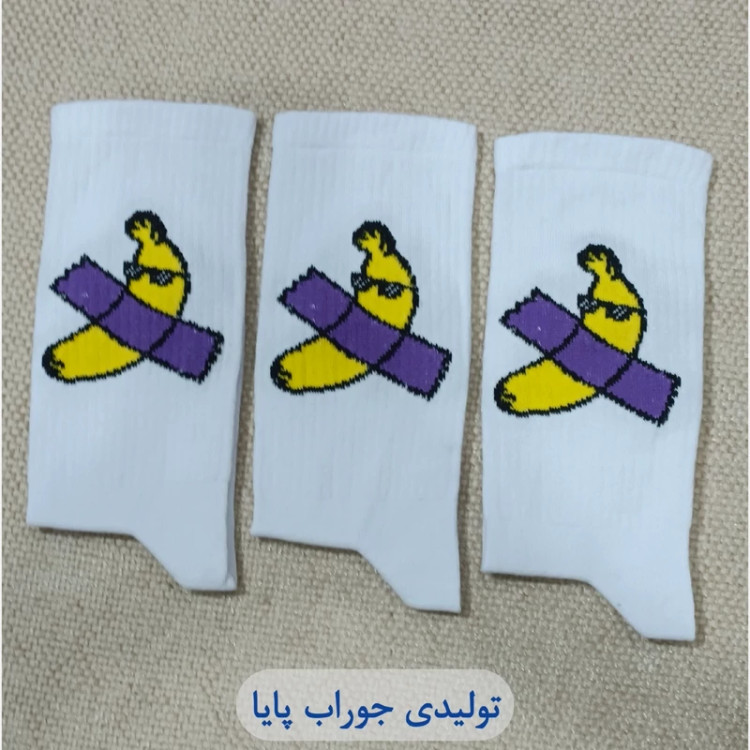 این جوراب سفید با طرح موز زرد که نوار بنفش دورش پیچیده (الهامگرفته از هنر معاصر)، حس طنز و خلاقیت به پاهاتون میده. متریال با کیفیت و نرم، تنفسپذیر و راحت برای استفاده روزانه.